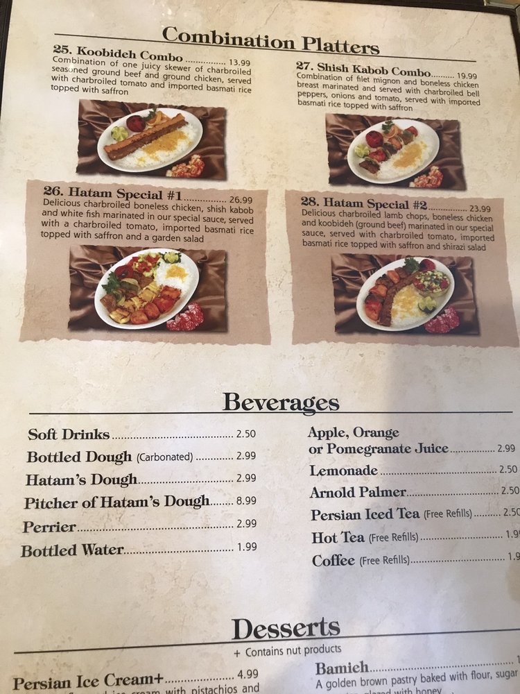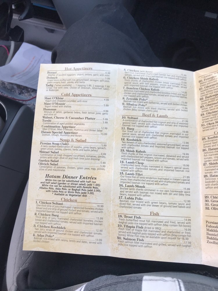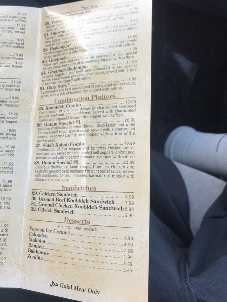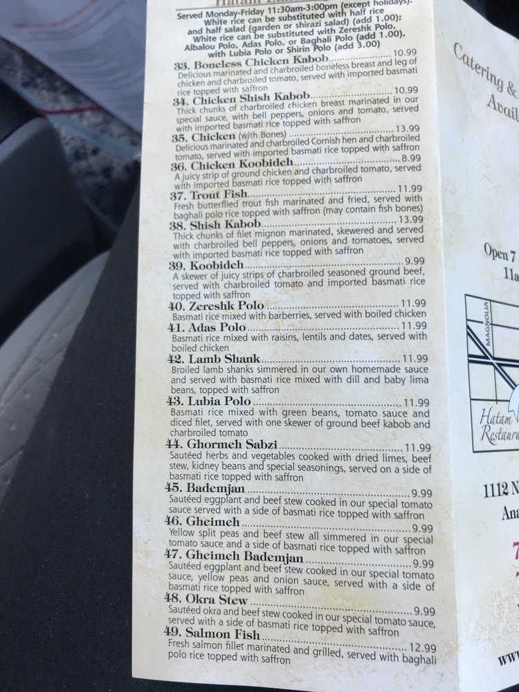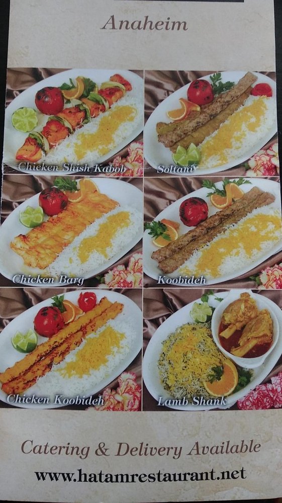 Hatam Restaurant offers a diverse menu with vegan and limited vegetarian options, catering to a variety of dietary preferences. Located in Anaheim, CA, this restaurant provides a casual dining atmosphere with options for takeout and delivery. Known for its Persian cuisine, Hatam has received rave reviews from customers who praise the delicious and beautifully presented dishes. From succulent chicken and beef koobideh to flavorful stews, the menu showcases authentic and satisfying Middle Eastern flavors. The restaurant's inviting ambiance, complete with rugs decorating the walls and a koi pond, adds to the dining experience. With ample parking and attentive staff, Hatam Restaurant is a must-visit for those seeking a taste of Persian cuisine in Orange County.